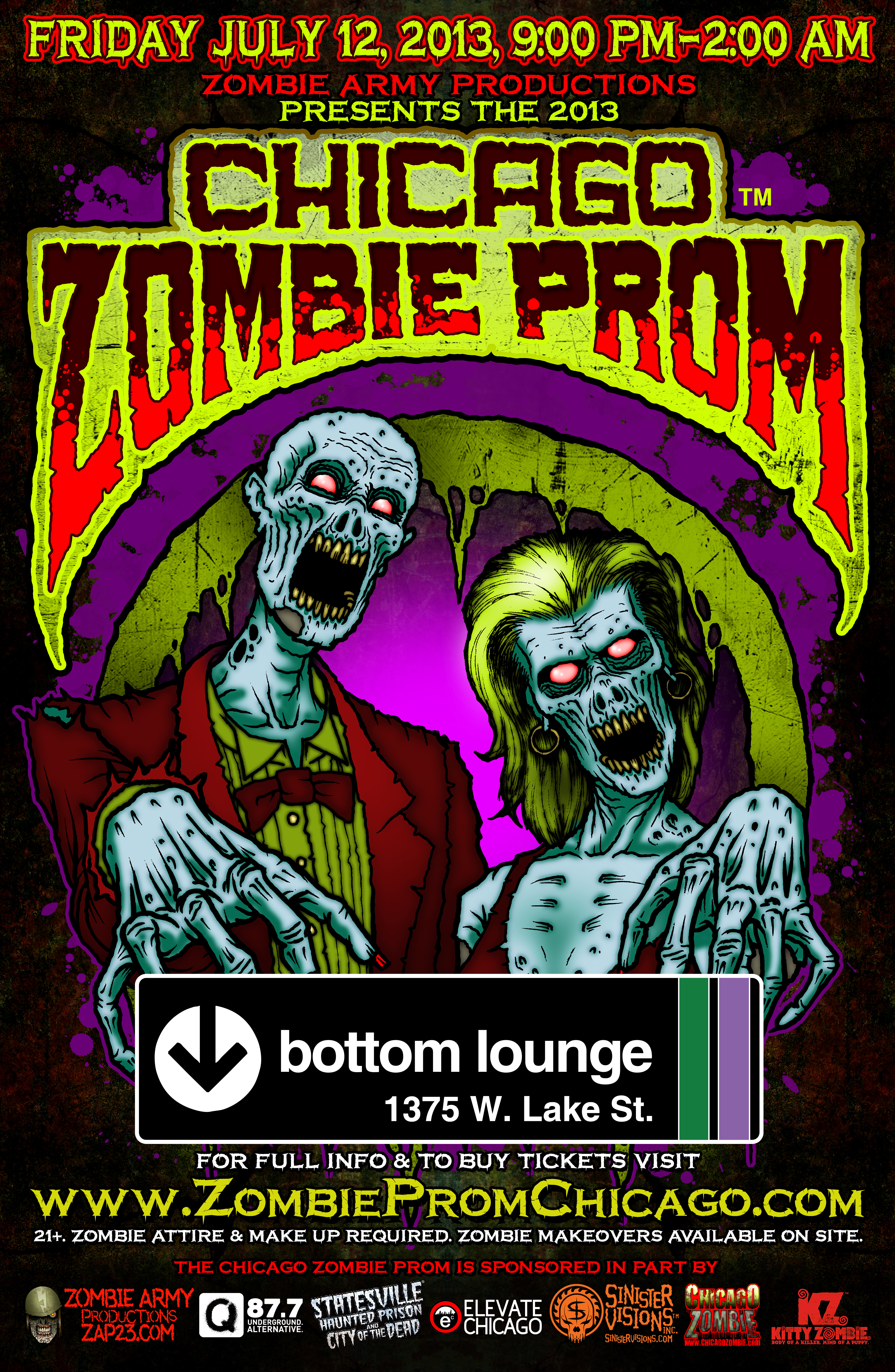 Other Chicago Zombie Prom highlights include the annual Zombie Prom King & Queen contest, a photo booth and a free buffet (open from 9:00-10:30pm). Throughout the night there will be prizes and giveaways from Zombie Prom Chicago’s sponsors, which currently include Zombie Army Productions, Riot Fest, Elevate Chicago, Q101.1 and ChicagoZombie.com.