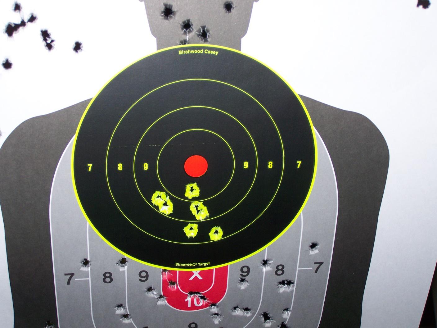 This ten shot group at ten yards shows that the gun groups well. It appeared to be shooting low at ten yards. This is about a three inch group, and it did perform consistently along those lines.