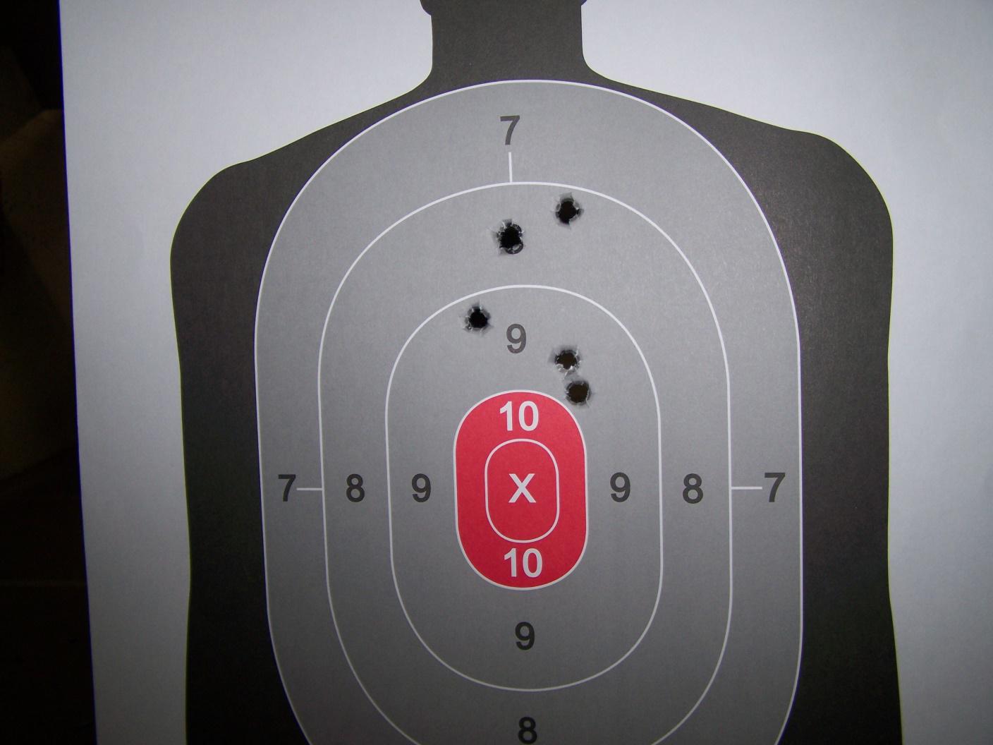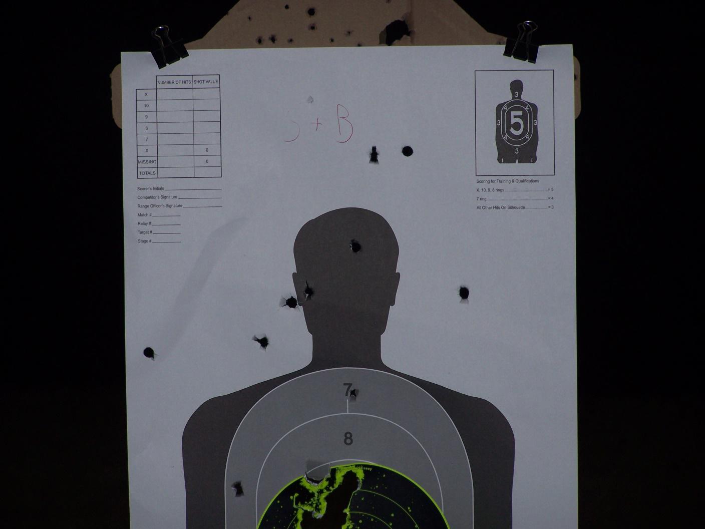 The target here shows the pattern from 3 shots of Winchester PDX1 loads at 5 yards. These loads feature three copper plated flattened “defense disks” followed by a handful of #4 shot. Shooting 3 inch .410 loads is definitely when you appreciate the rubber grips on this handgun.